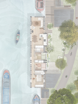 The brief was for a spacious, level-access family home above the waterline – a significant departure from the traditional canal barge typology where interiors sit below the water line, often resulting in cold and damp conditions. The constrained 4×20 metre footprint, dictated by the mooring and canal width, demanded a highly efficient plan incorporating open-plan living, a primary suite, two children’s bedrooms and a shared bathroom.