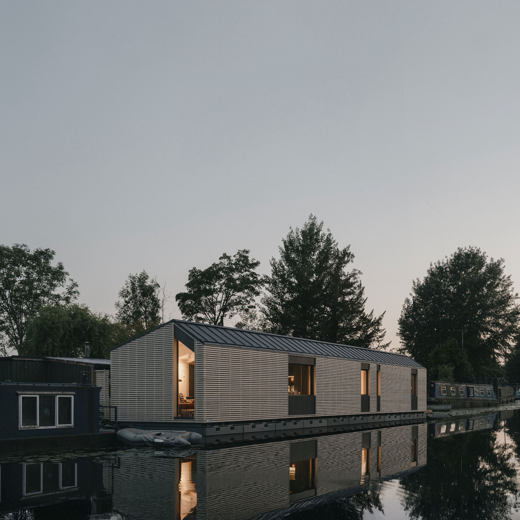 TiggColl has completed The Float House, a modular, floating family home designed for a private residential mooring in Ruislip, northwest London. Replacing an existing canal barge that no longer met the client’s needs, the project rethinks the possibilities of water-based living, combining spatial ingenuity with environmental responsiveness and long-term adaptability.