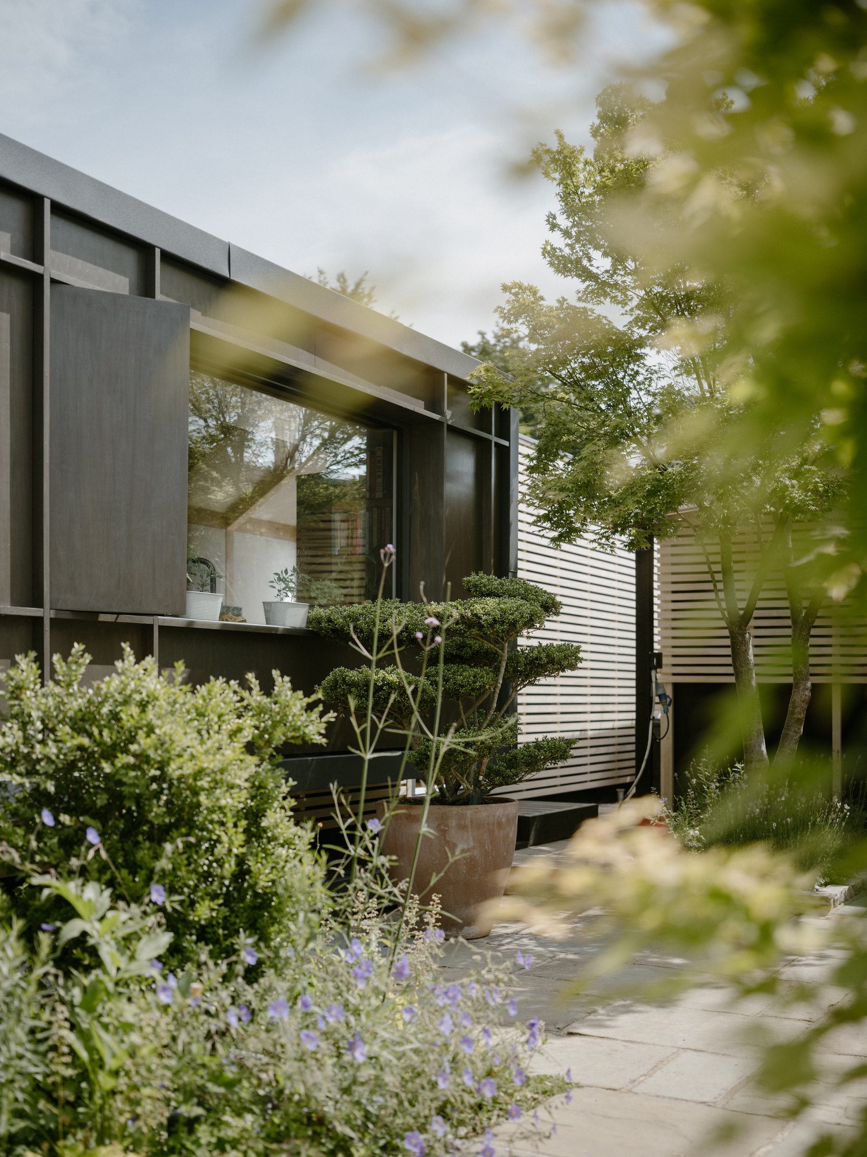 Externally, the house is clad in horizontal Accoya timber slats – chosen for their durability, low maintenance and weathering character. Cantilevered window bays extend beyond the linear plan, adding space for kitchen worktops, sleeping niches, and built-in seating, as well as providing ventilation and solar shading. They also form a distinctive rhythm to the bankside elevation and strengthen the home’s connection to the landscape.
