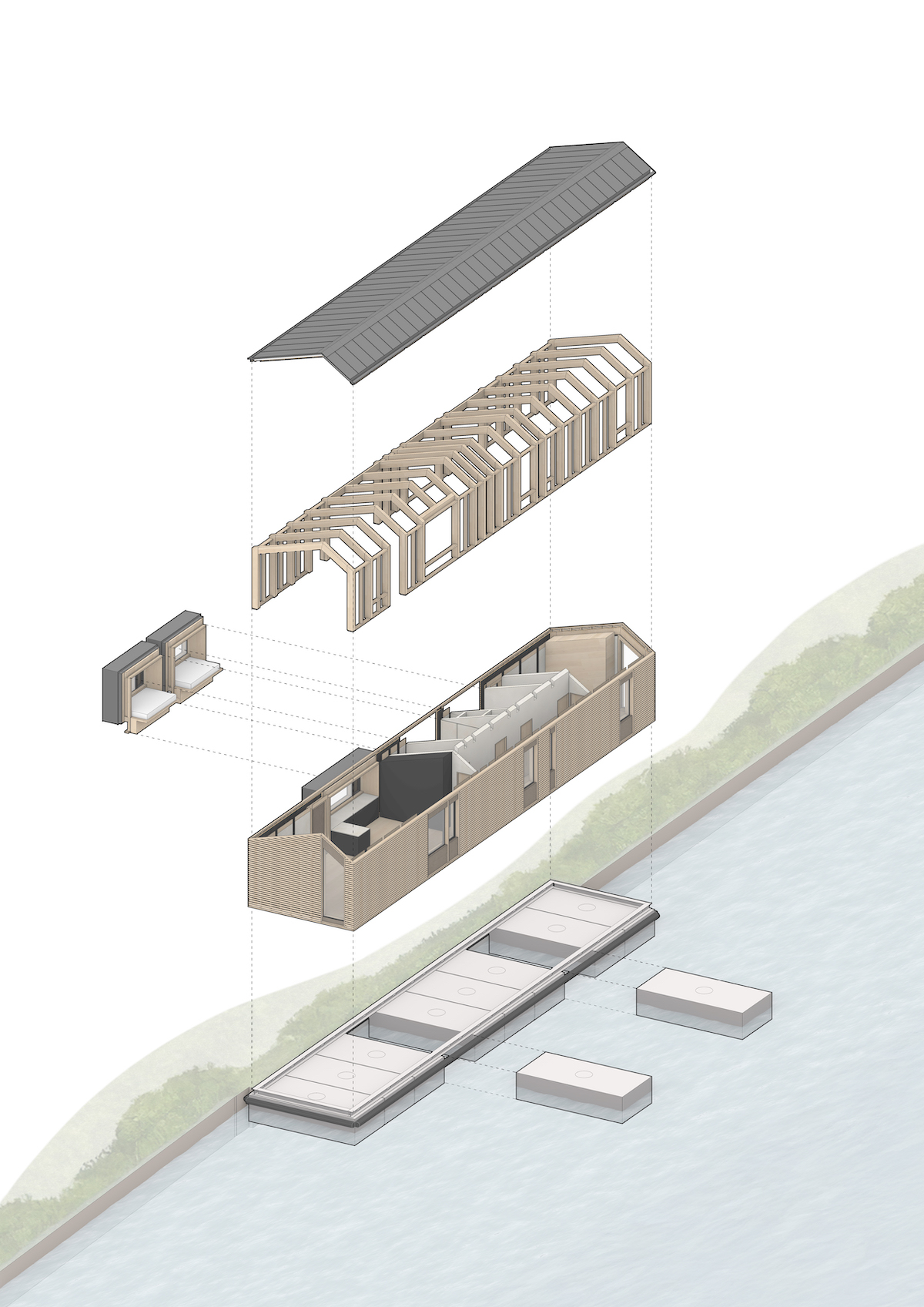 Working closely with marine and structural engineers, the architect developed an innovative system of ten interlocking steel hulls secured by a central gantry. This chassis allows each section to be floated away and maintained independently, overcoming challenges posed by the low bridges and lack of dry dock access along the canal. The prefabricated hull system also minimises site disruption and enables future-proofed maintenance without reliance on specialist lifting infrastructure.