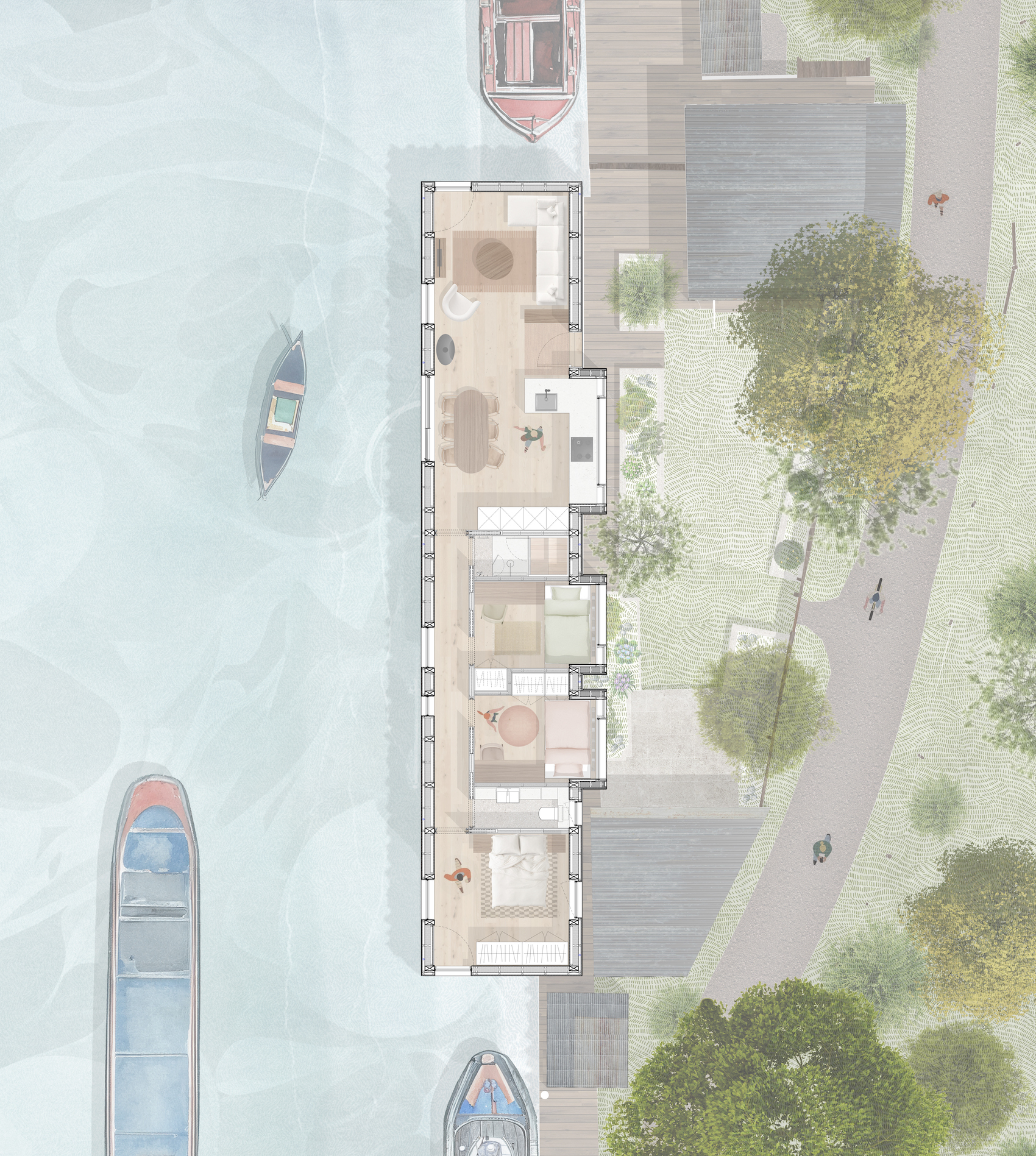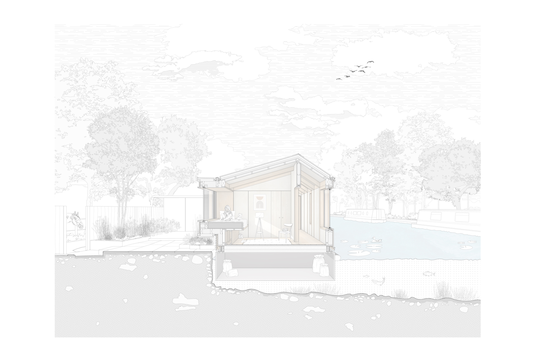 The brief was for a spacious, level-access family home above the waterline – a significant departure from the traditional canal barge typology where interiors sit below the water line, often resulting in cold and damp conditions. The constrained 4×20 metre footprint, dictated by the mooring and canal width, demanded a highly efficient plan incorporating open-plan living, a primary suite, two children’s bedrooms and a shared bathroom.