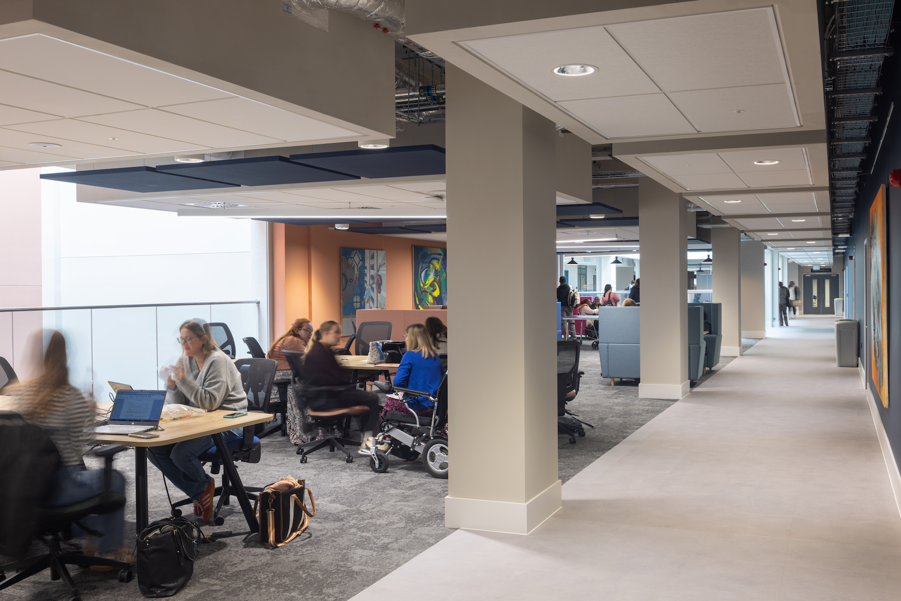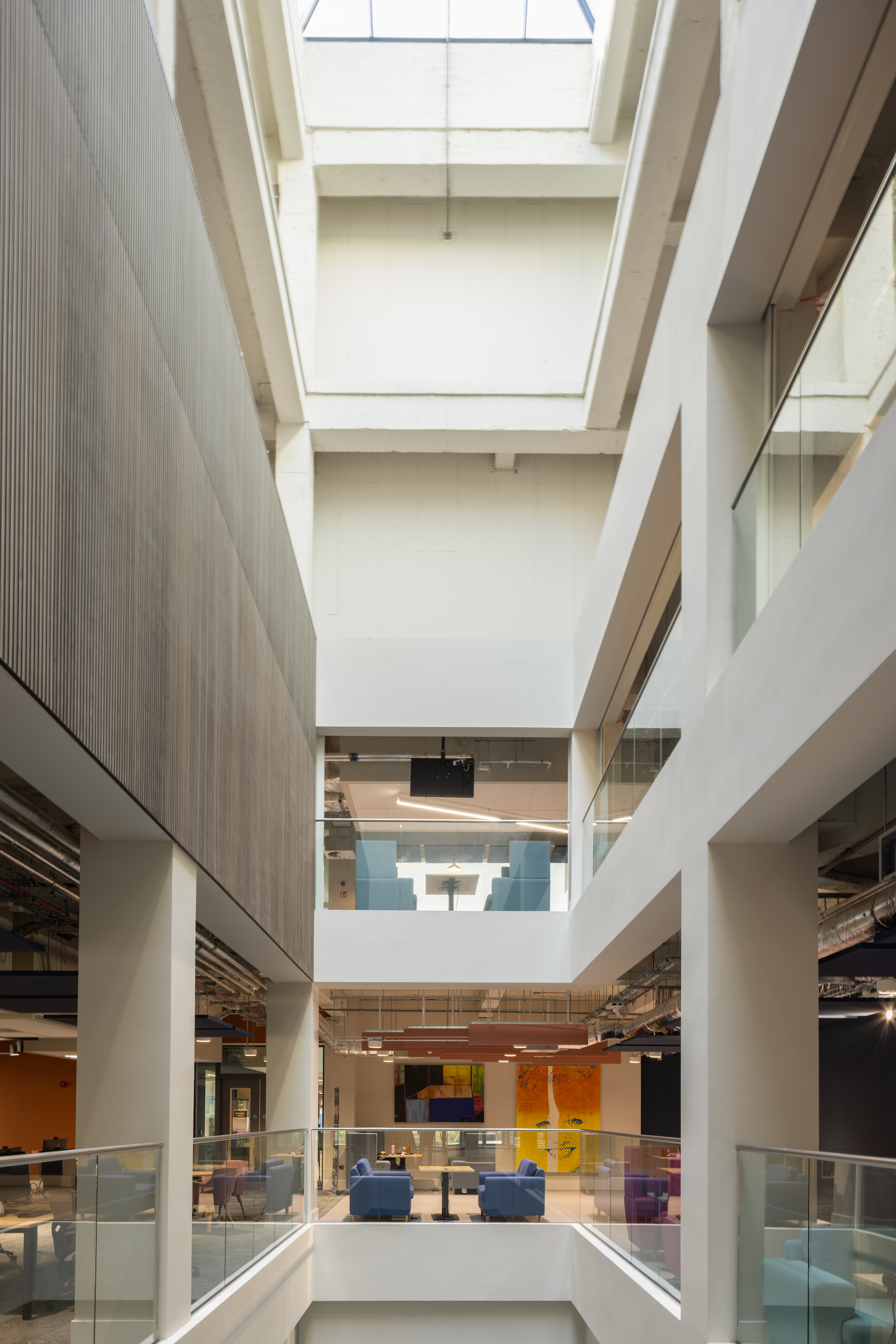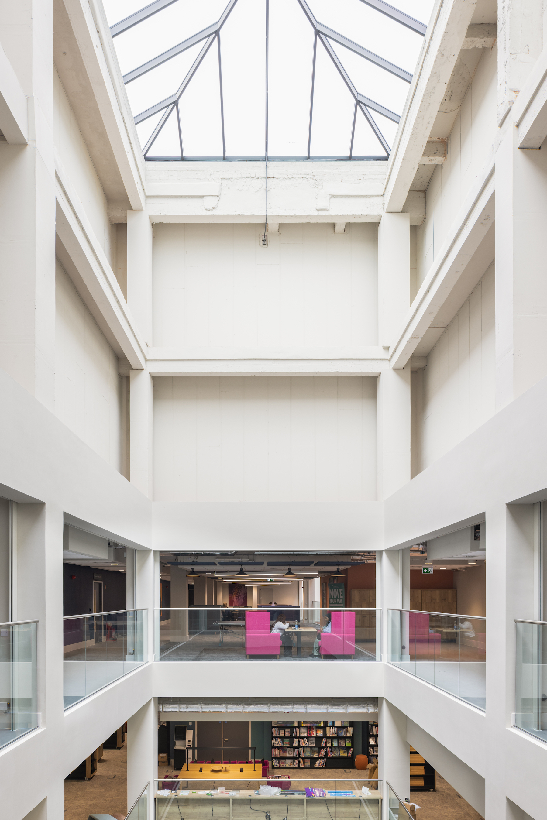 ADP worked closely with a conservation officer to retain the original features of the building, such as the restoration of the leaded tracery from the original shop windows. Internal floor plates were re-carved to open up the internal spaces to a series of light wells, creating a ribbon of balconies across the floors – an upgrade not only brings natural light into study spaces but assists with way-finding, which is emphasised through a vibrant colour and textile palette.