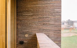 The result is crystalised as a 12-sided dark brick form – irregular in a good way – capped with a bright white roof structure and contoured by an set of skewed oak windows dancing around each elevation. The building combines the rigour of a Peter Zumthor-esque brick form and the dynamic elevations of Enric Miralles’ architecture.