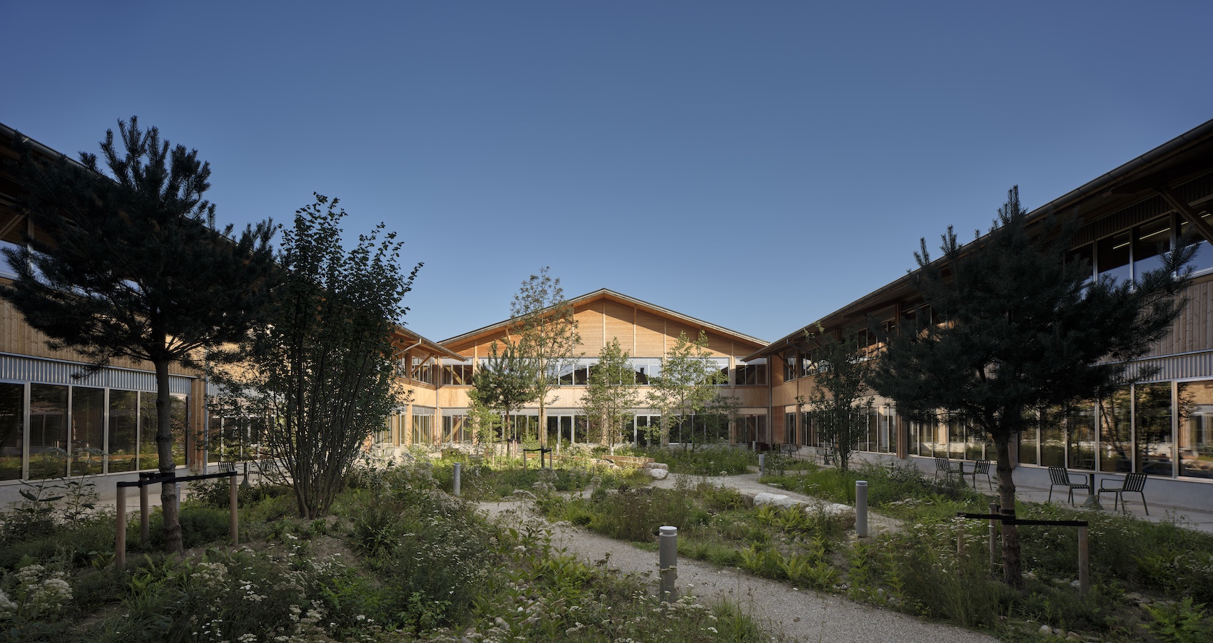 Carefully considered landscape design extends the architectural concept beyond the building envelope. Courtyards are planted with species that reflect the local ecology, while external areas have been reconfigured to prioritise nature over infrastructure. Concrete elements removed during construction are reused as pathways and outdoor features, creating continuity between building and site. The planting is intended to mature over time, and contribute to shading and microclimate regulation, further enhancing environmental performance.