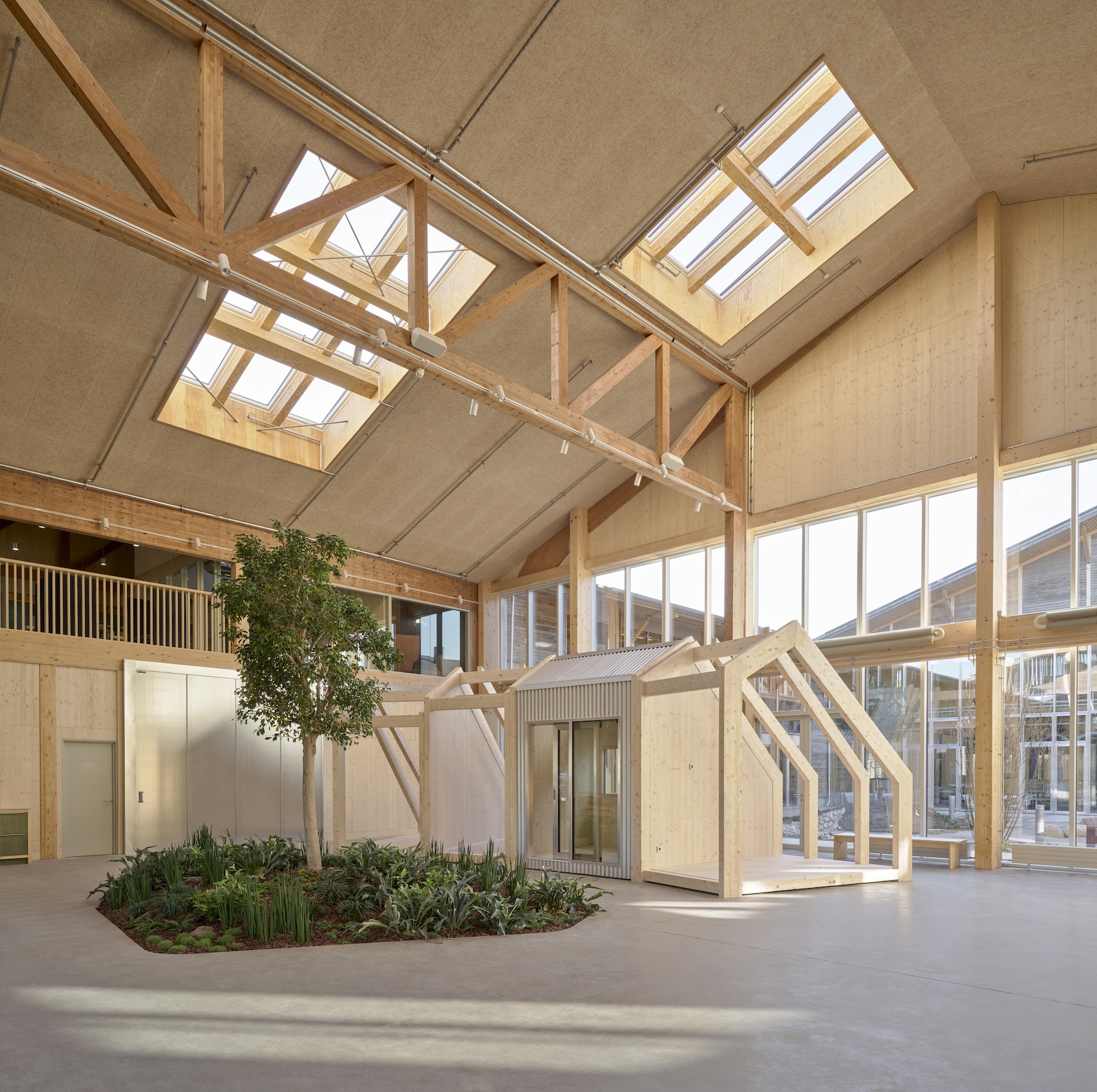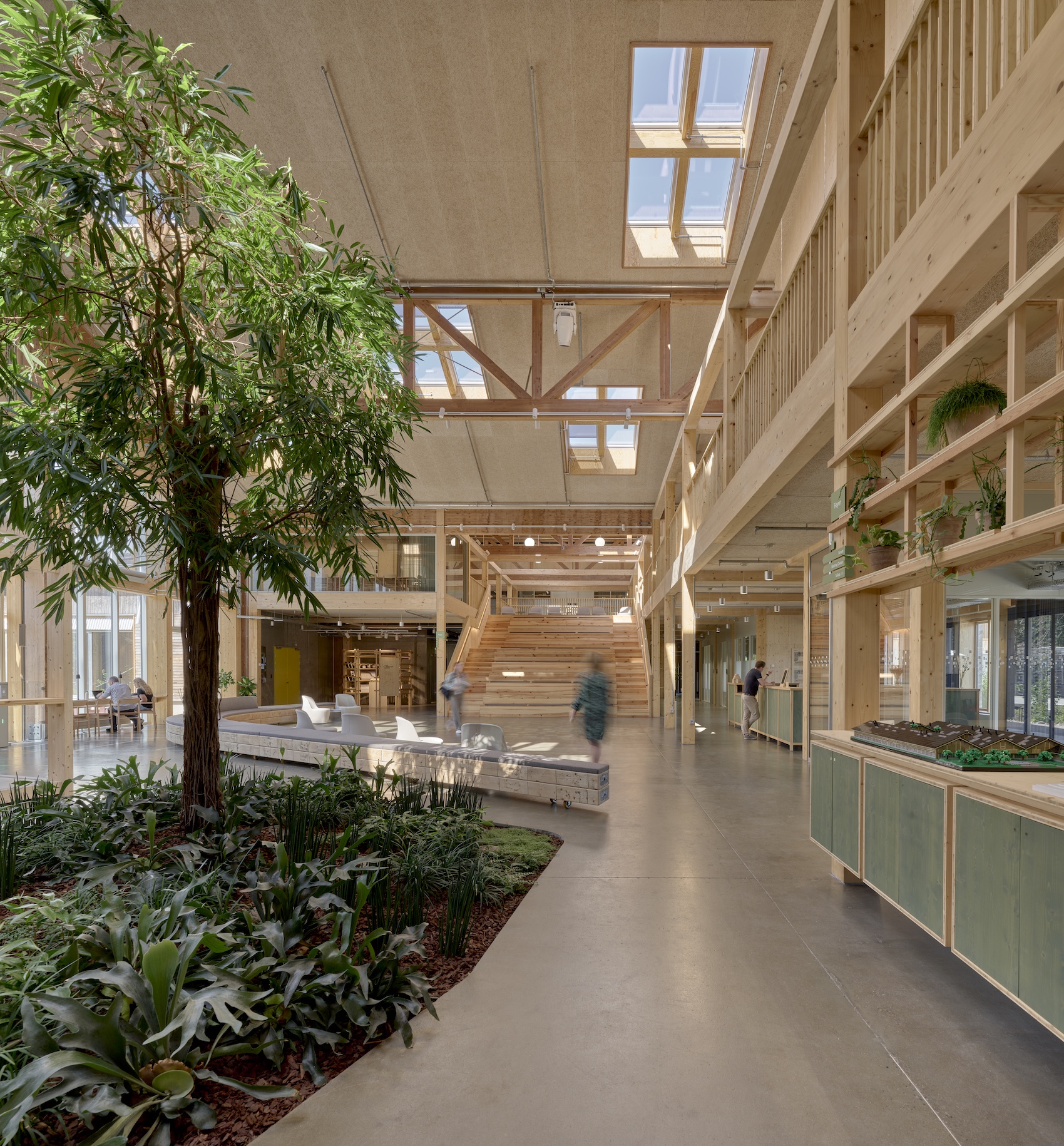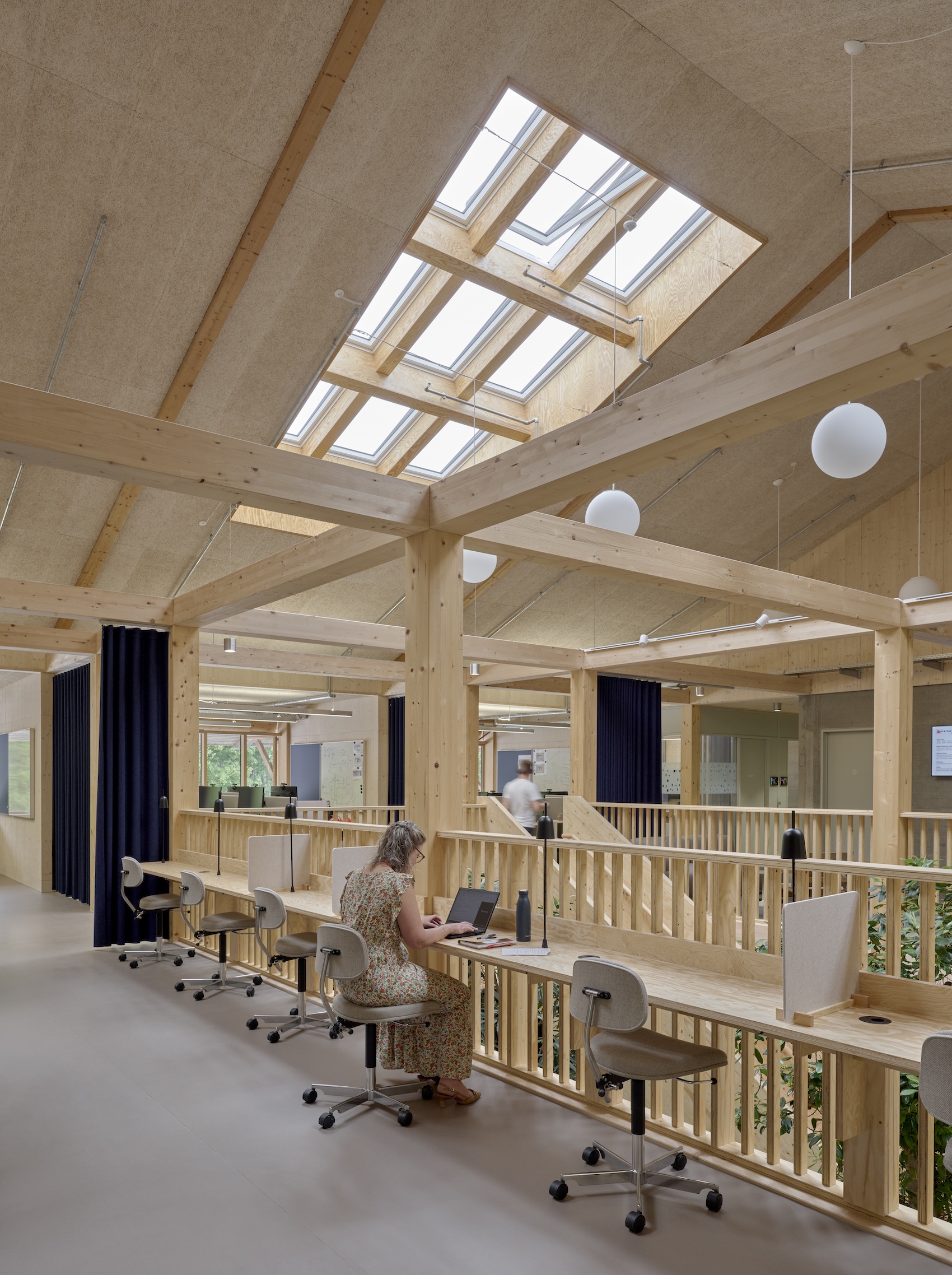 The office areas are organised into ‘neighbourhoods’, each associated with a particular team or function. Within these, flexible workstations, meeting rooms and informal spaces allow users to choose where and how they work. There are no fixed desks or private offices, including for management. Instead, a shared desk system operates at around 65 per cent occupancy, encouraging mobility and interaction. This flexibility is supported by a variety of spatial types, including open desk areas, small meeting rooms, mini-workshops within office zones, and large workshops and laboratories. The intention is to create opportunities for chance encounters and knowledge exchange. As Tony puts it the building is designed so that “you meet each other and join forces in order to innovate.”