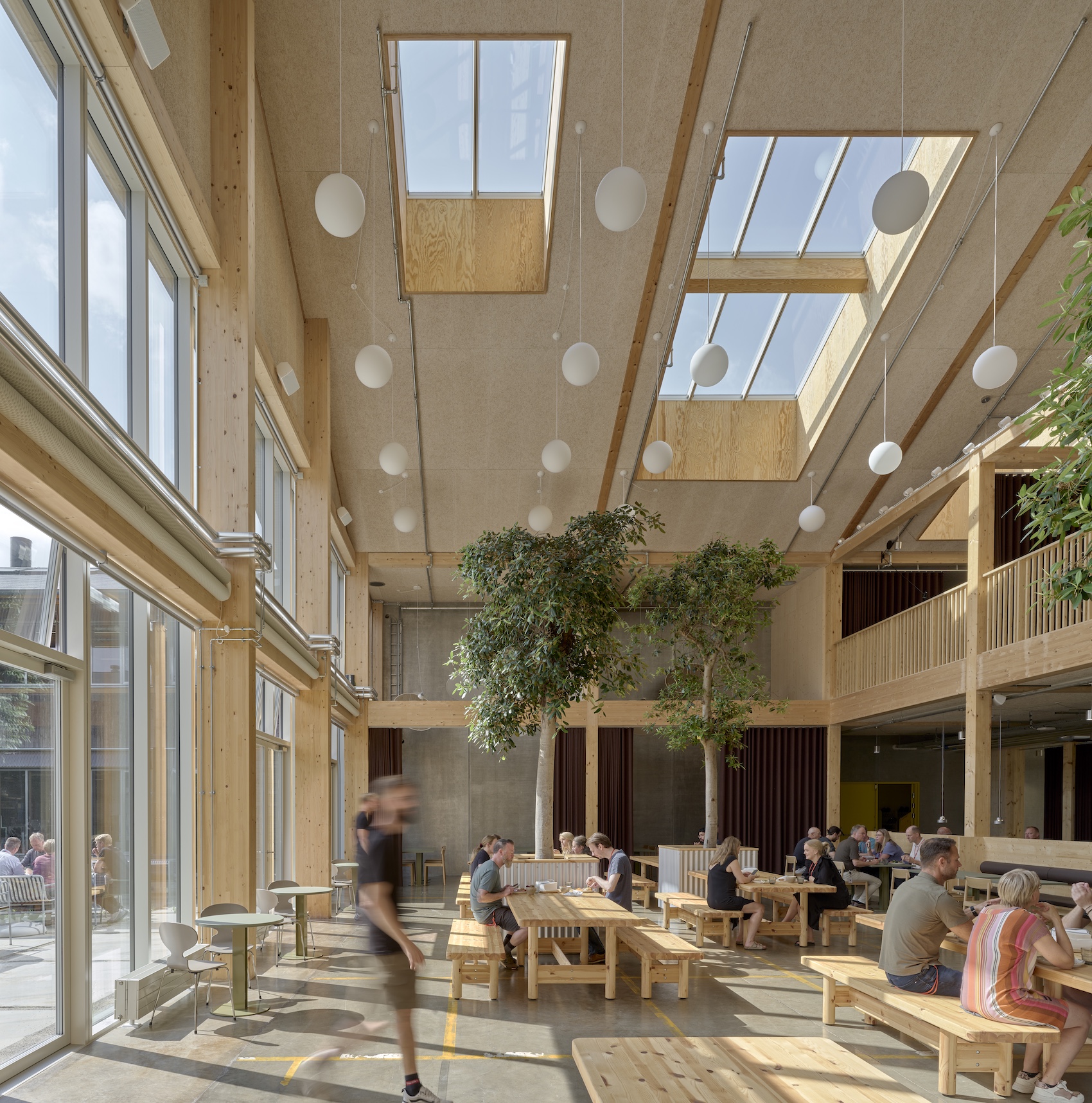 Sited adjacent to a 70,000m² publicly-accessible park known as Nature Østbirk, the warehouse had previously been surrounded by parking and industrial infrastructure. The redesign reverses this condition, pushing cars away and drawing nature closer via perimeter planting and landscaping, as well as a pair of generous courtyard ‘gardens’ sunk into the deep plan. The latter addressed one of the key design challenges: how to get daylight and ventilation into a largely windowless warehouse measuring 120×75 metres. “By cutting into the building and incorporating the two courtyards, we were able to bring nature from the outside in and invite everyone to be surrounded by it under the sky,” says Tony.
