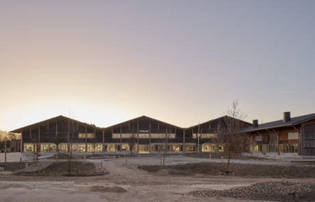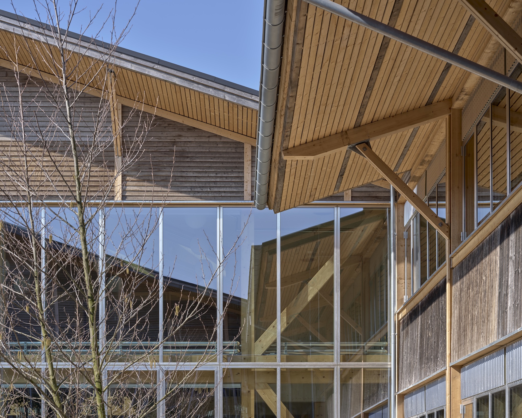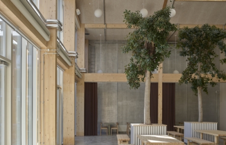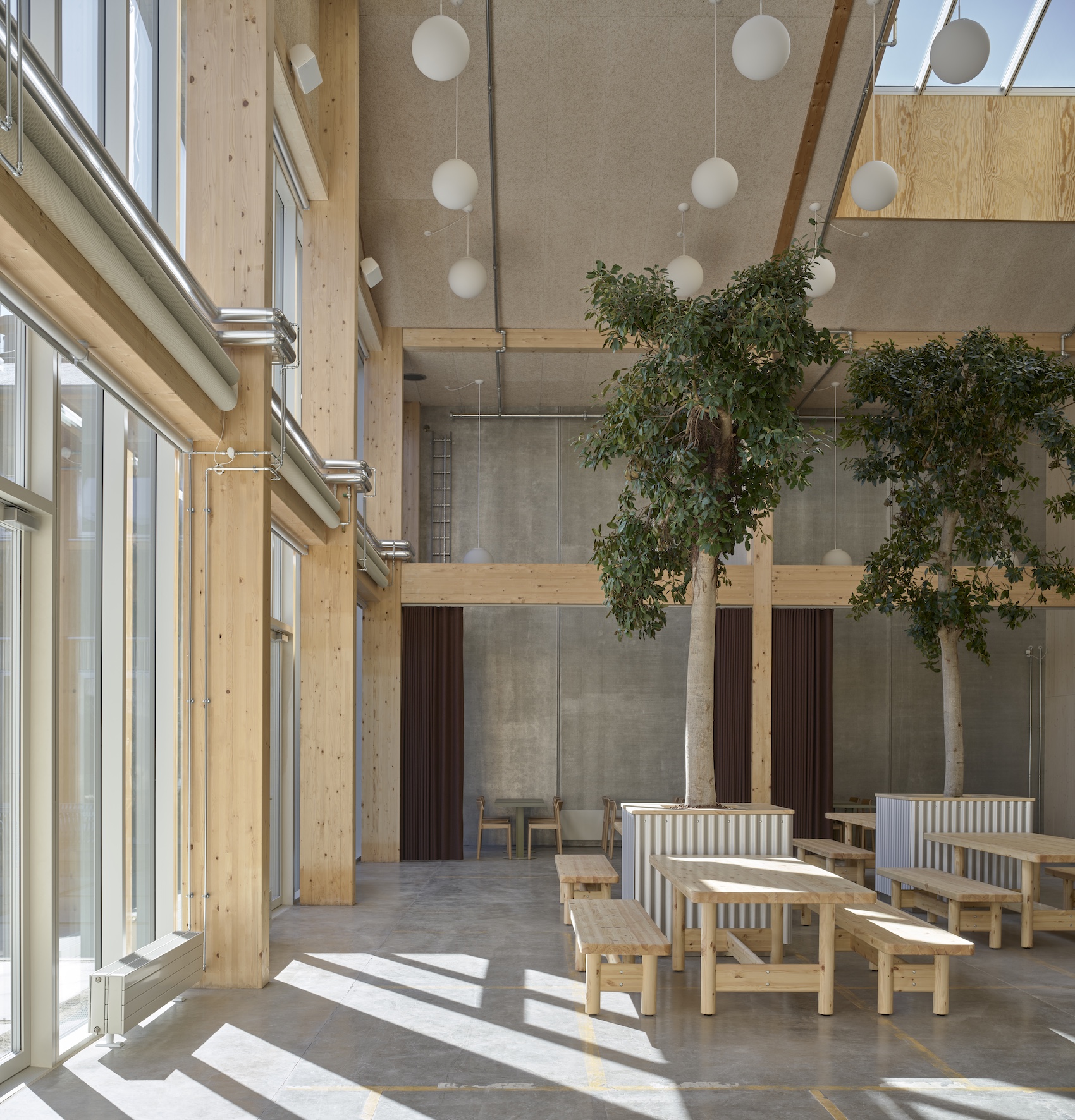 One of the project’s most defining features is its reuse of existing construction materials. More than 55 per cent of the materials that would have been required for a new building were saved through retention and repurposing. Key elements that were retained include the primary timber structure, concrete floor slab, roof structure, and internal concrete walls. Where materials were removed, they were reused within the project or elsewhere on site. Timber elements, for example, were repurposed for insulation, façades and furniture, while concrete components were reused as paving and landscaping features.