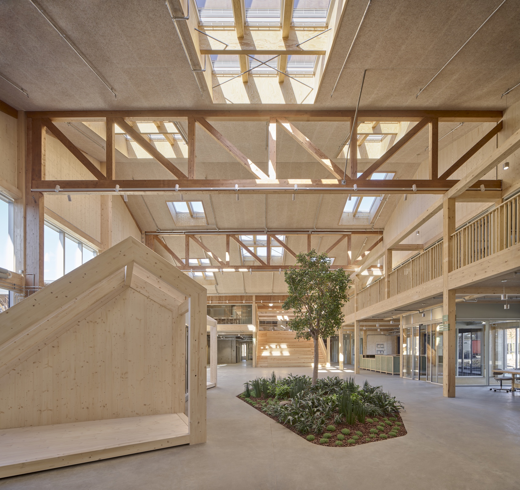 Thermal comfort is based on an adaptive comfort model, which allows for seasonal variation and user interaction. The building achieves a CO2 footprint of 4.6 kg CO2e/m²/year, significantly below current and proposed Danish regulatory limits. The combination of courtyards and rooflights ensures that all workspaces have access to natural light, reducing the reliance on artificial lighting and supporting occupant wellbeing.
