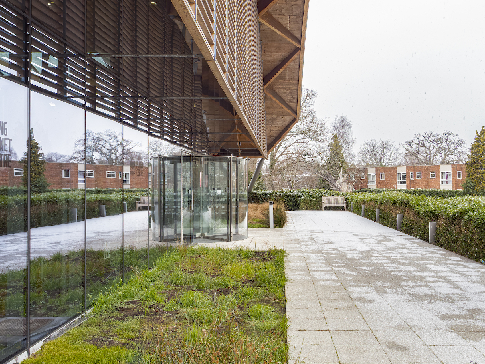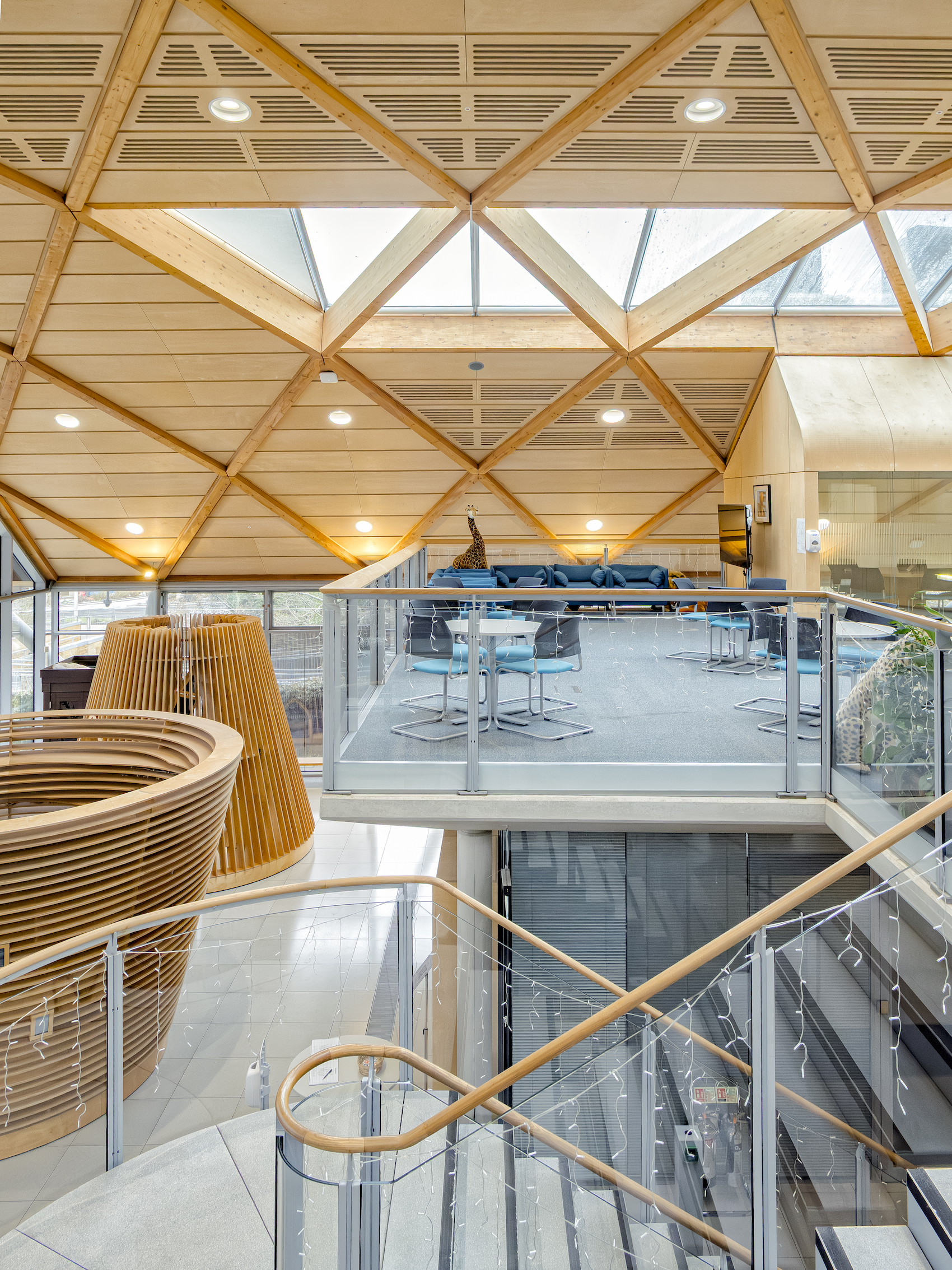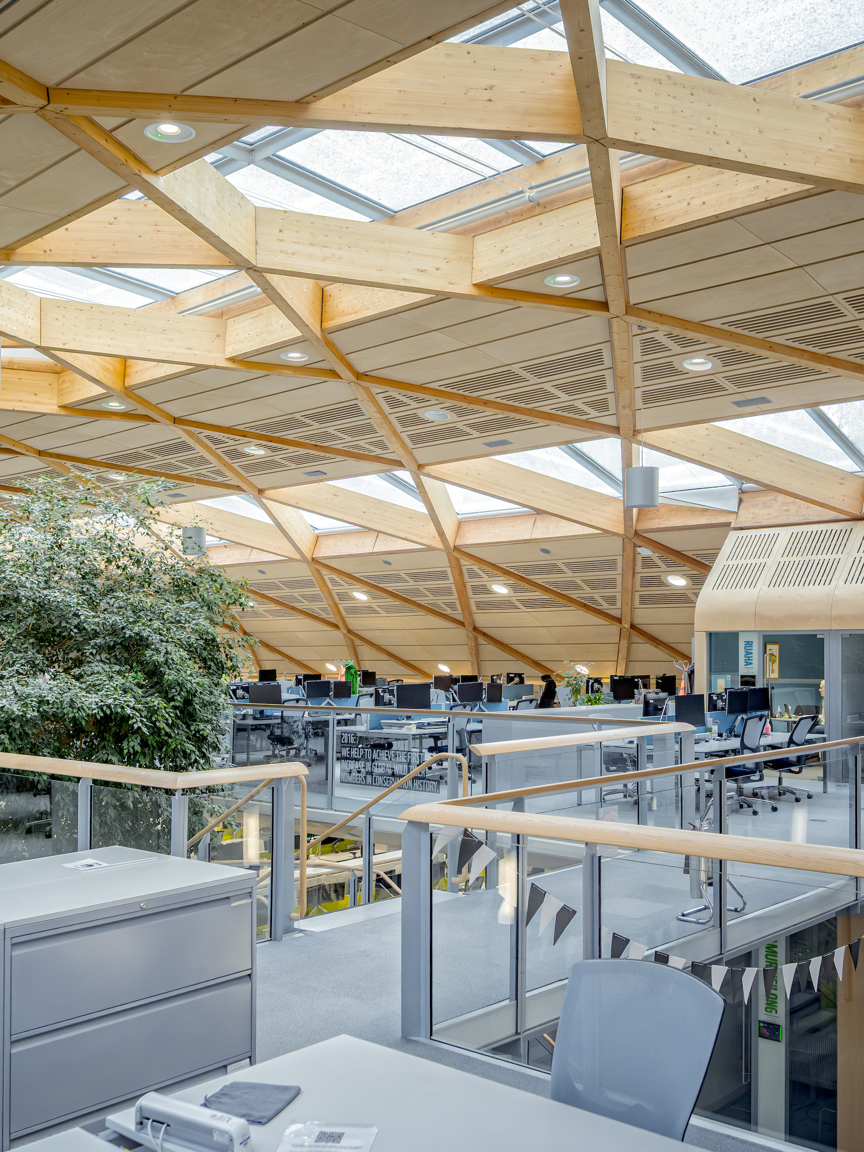 The building is raised on a concrete podium above an existing public car park, which needed to be reconfigured and retained. A wide, column-free plan with raised access flooring provides open-plan workspace for more than 300 staff, promoting collaboration while allowing for easy reconfiguration of the internal layout as working practices evolve. Conference facilities and education and exhibition space are available for use by the wider community, as well as the organisation itself. The building is topped by a timber gridshell roof with integrated photovoltaic panels and wind cowls.