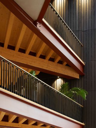 Stairs double up as seating, hugging the glazed façade which frames views of York Minster and a stubby bit of centuries-old Gothic architecture pokes out above a more immediate roofline. The aim is for the atrium to be used as a “living room” by the students — a place to relax and congregate beyond the student union and dining halls; already, it’s being well used. It’s not all timber: red oxide-coloured steel punctuates sections of cross-laminated timber (CLT) and glulam, serving as a structural component in conjunction with the timber.