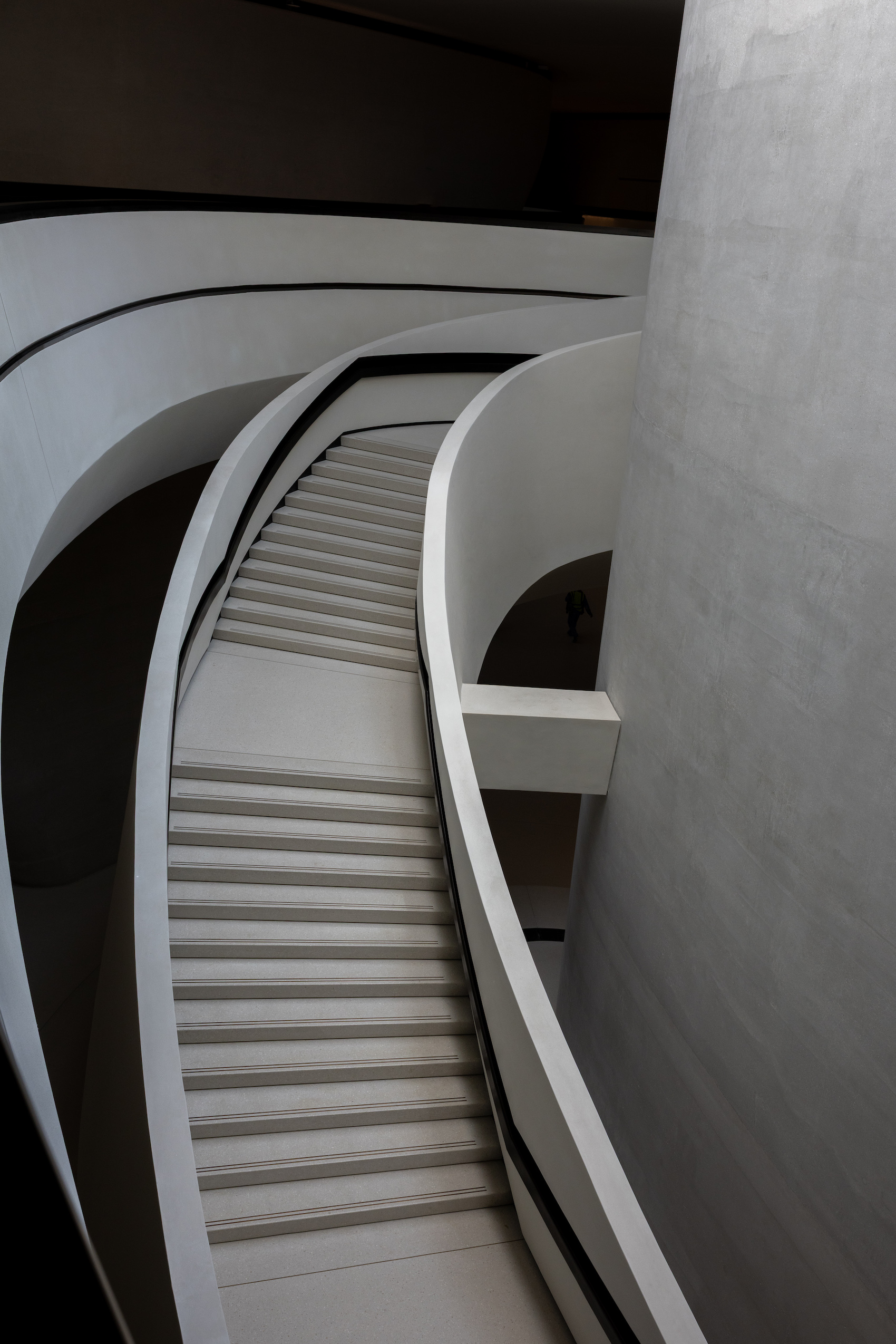 More than 6,600 unique, triple-laminated glazed units are employed across the towers, whose orientation was carefully modelled based on the sun’s movement to maximise daylight in the lobby and gallery spaces. The steel structures are supported by an aluminium-clad welded framework, and the entire complex sits atop a piled foundation with slip-formed concrete basement walls.