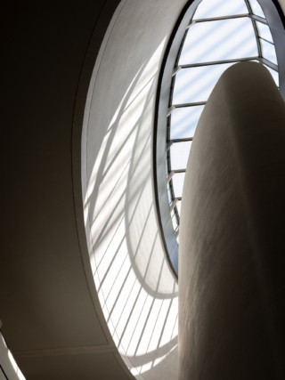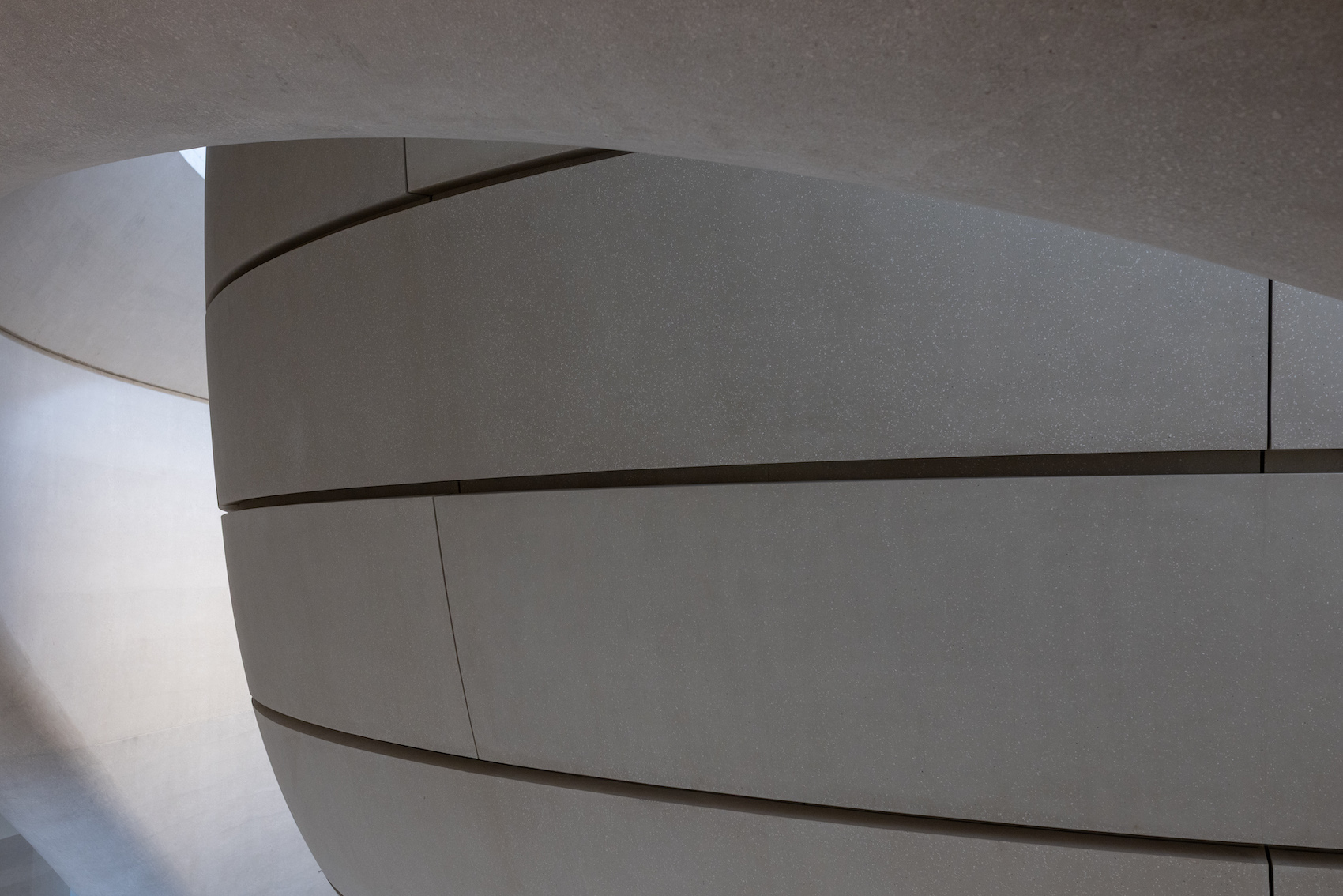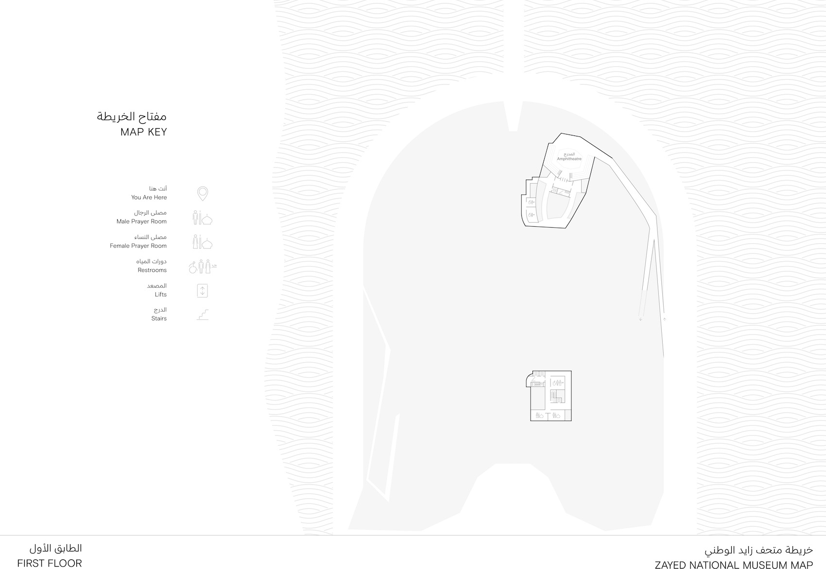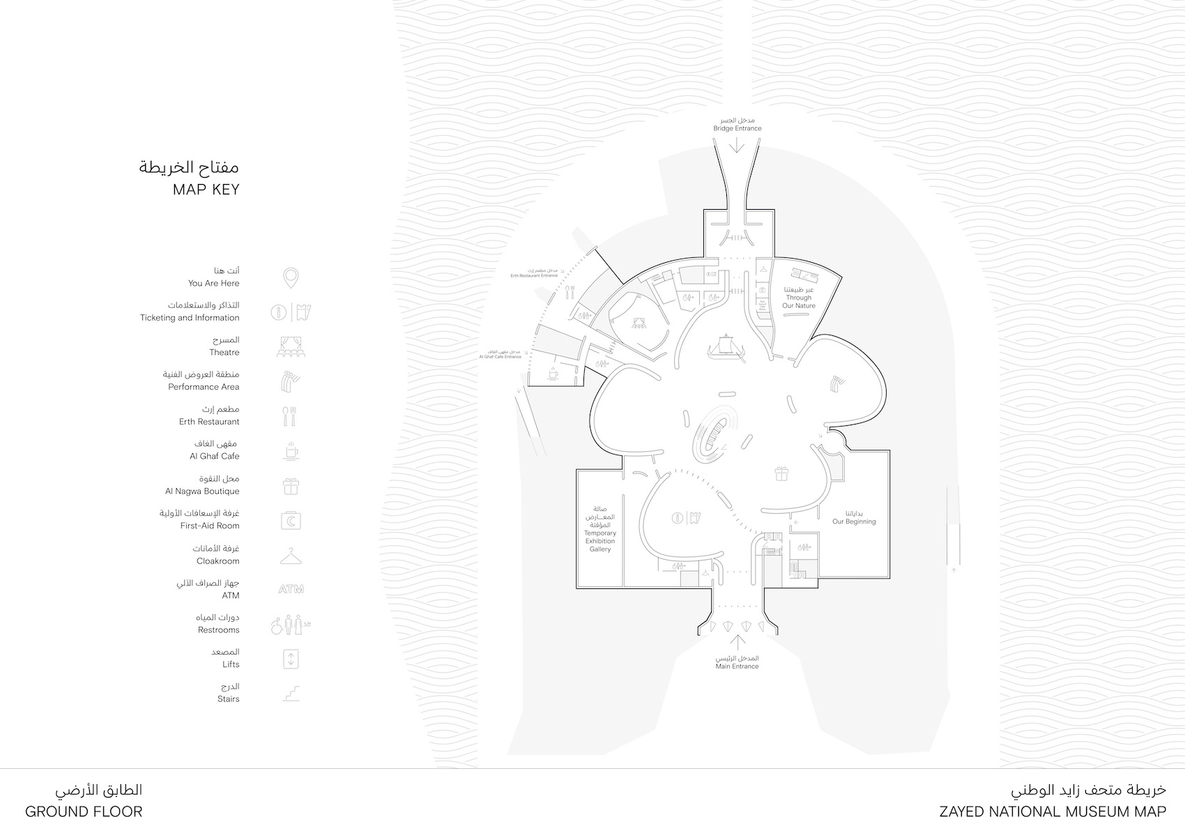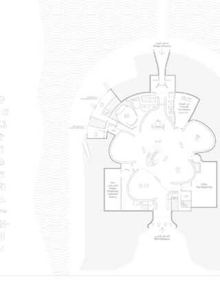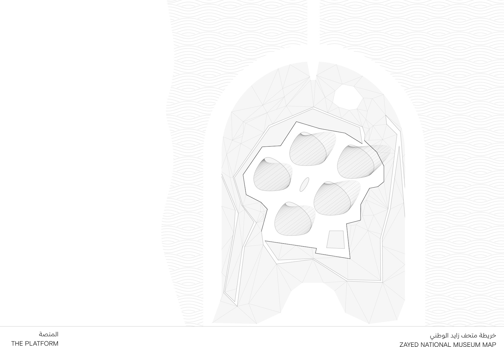 Located on Saadiyat Island, the museum comprises seven galleries (six permanent and one temporary) arranged within a sculptural complex inspired by the wings of a falcon – a symbol of Emirati heritage. Five lightweight steel structures rise above an earthen mound that forms the base of the museum, their soaring forms acting both as an architectural emblem and as thermal chimneys to drive passive cooling throughout the building.