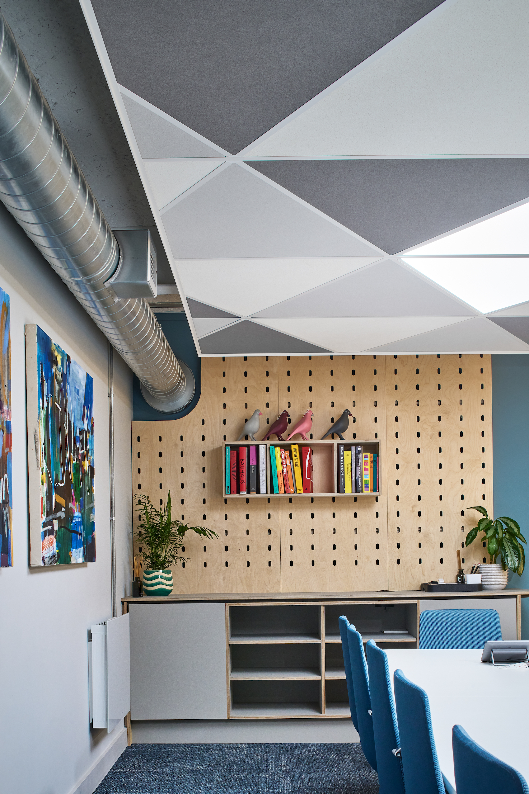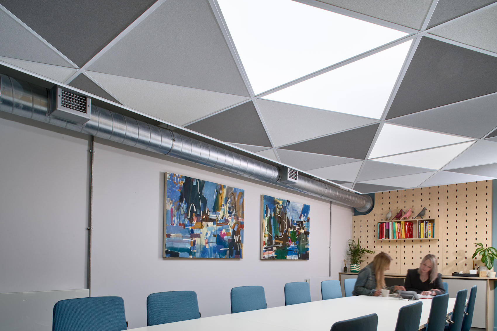 The meeting room containing the Zentia ceiling solution is positioned next to the kitchen and at the bottom of the main staircase, meaning people were often walking past. The room is also primarily used to host presentations and board meetings, so an acoustically sound solution was essential.